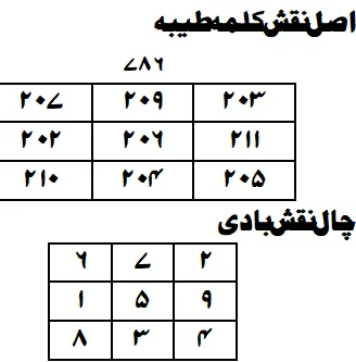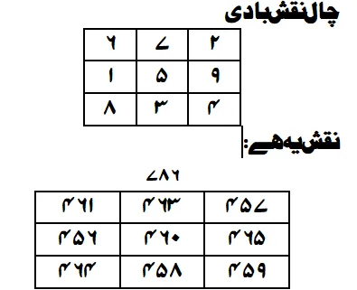 مثلاً ہم عبدالرحمٰن ابن فاطمہ کےلئے کشائش رزق کے لئے نقش بنانا ہے تو اس کے لئے سب سے پہلے حروف کے اعداد 533 لئے۔ اس کے بعد سائل کے نام مع والدہ کے اعداد لئے جو 540 بنتے ہیں۔ اس میں اللہ کے نام یا رزاق کے اعداد 308 لئے ان تینوں اعداد کا مجموعہ 1381 ہے۔ حسب قاعدہ اس سے 12 قانون کے عدد نفی کئے تو باقی 1369 بچے۔ ان کو 3 پر تقسیم کیا تو حاصل قسمت 456 آیا اور باقی بچا ایک ۔ یہ کسر ہے اس لئے خانہ 7 میں ایک کا اضافہ کریں گے۔ چونکہ یہ نقش کشائش رزق کے لئے ہے اس لئے اس نقش کو بادی چال سے لکھیں گے۔ یہ نقش دو عدد لکھے جائیں گے۔ ایک سائل اپنے پاس رکھے گا اور دوسرا کسی پھلدار درخت کے ساتھ باندھ دے گا تاکہ ہوا سے ہلتا رہے اور کسی نماز کے بعد اسم یا رزاق کو مجموعہ کے اعداد کے مطابق یعنی 1381 بار روزانہ پڑھے۔ انشاء اللہ ہفتہ کے اندر سائل کو خود معلوم ہو جائے گا کہ اس کے رزق میں کتنی برکت ہوگئی ہے نقش درج ذیل ہے۔