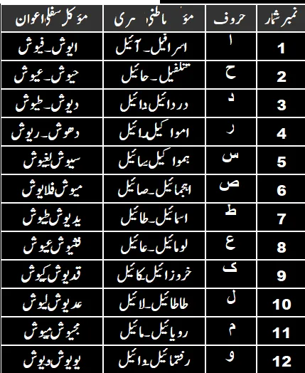 حروف صوامت کے مؤکلات کا تذکرہ اس لئے ضروری خیال کیا گیاتاکہ عاملین جو عمل بنائیں وہ پڑھتے وقت ان مؤکلات سے کام لے سکیں اور انہیں کسی قسم کی دشواری پیش نہ آئے۔ اب میں ترتیب وار ان کے مؤکلات کا تذکرہ کروں گا۔ نقشہ کو ذہن میں رکھیں۔