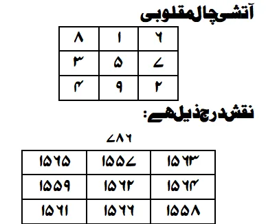وَ اَلْقیْنَا بَیْنَھُمُ الْعَدَاوَۃَ وَ الْبَغُضَاءَ اِلٰی یَوْمَ القِیَامَۃَ عدد اس کے 3337 ہیں۔ حروف کے اعداد 533 چاروں ناموں کے اعداد 815 اور آیت کے اعداد 3337 کا مجموعہ 4685 بنا۔ اس مجموعہ میں سے 12 قانون کے نفی کئے تو باقی 4673 بچے۔ ان اعداد کو 3 پر تقسیم کیا تو حاصل قسمت 1557 آیا اور باقی 2 کسر کے بچے اس لئے خانہ 4 میں ایک کا اضافہ کریں گے۔ نقش آتشی چال سے پُر کیا گیا ہے اور چال بھی دی گئی ہے۔